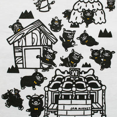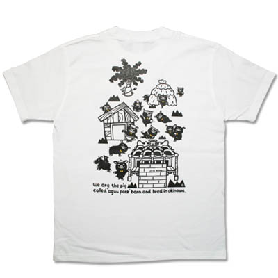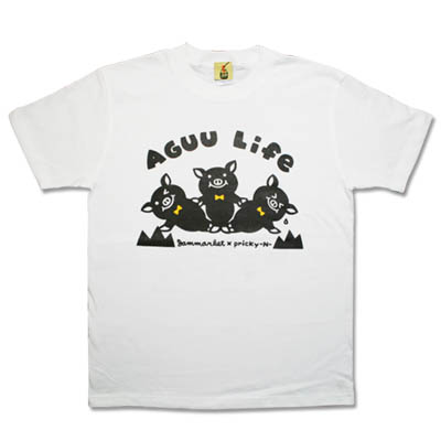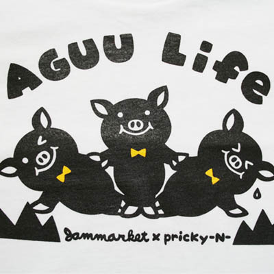 沖縄で活躍するイラストレーター「プリッキーNー(ヌー)」とのコラボTシャツ「アグー」。アグーとは今から600年前に中国から沖縄に渡って来たと言われている在来種と呼ばれている黒豚です。沖縄では高級食材ともされています。そんなアグーがTシャツにいっぱい出現!!ストレッチをしてたり、昼寝をしているアグーがいたりと愉快です!!子供用もありますので親子でお揃いもオススメです!!