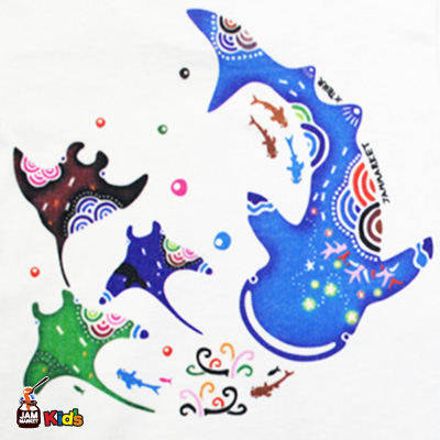 沖縄の海は南国ならではの珍しい生き物が数多く生息しています。海の中を覗いてみると美しい珊瑚礁や、ジンベエザメやマンタ、沢山の魚達が楽しそうに泳ぐ情景が浮かんできます。その様子を紅型風にデザインしました。
