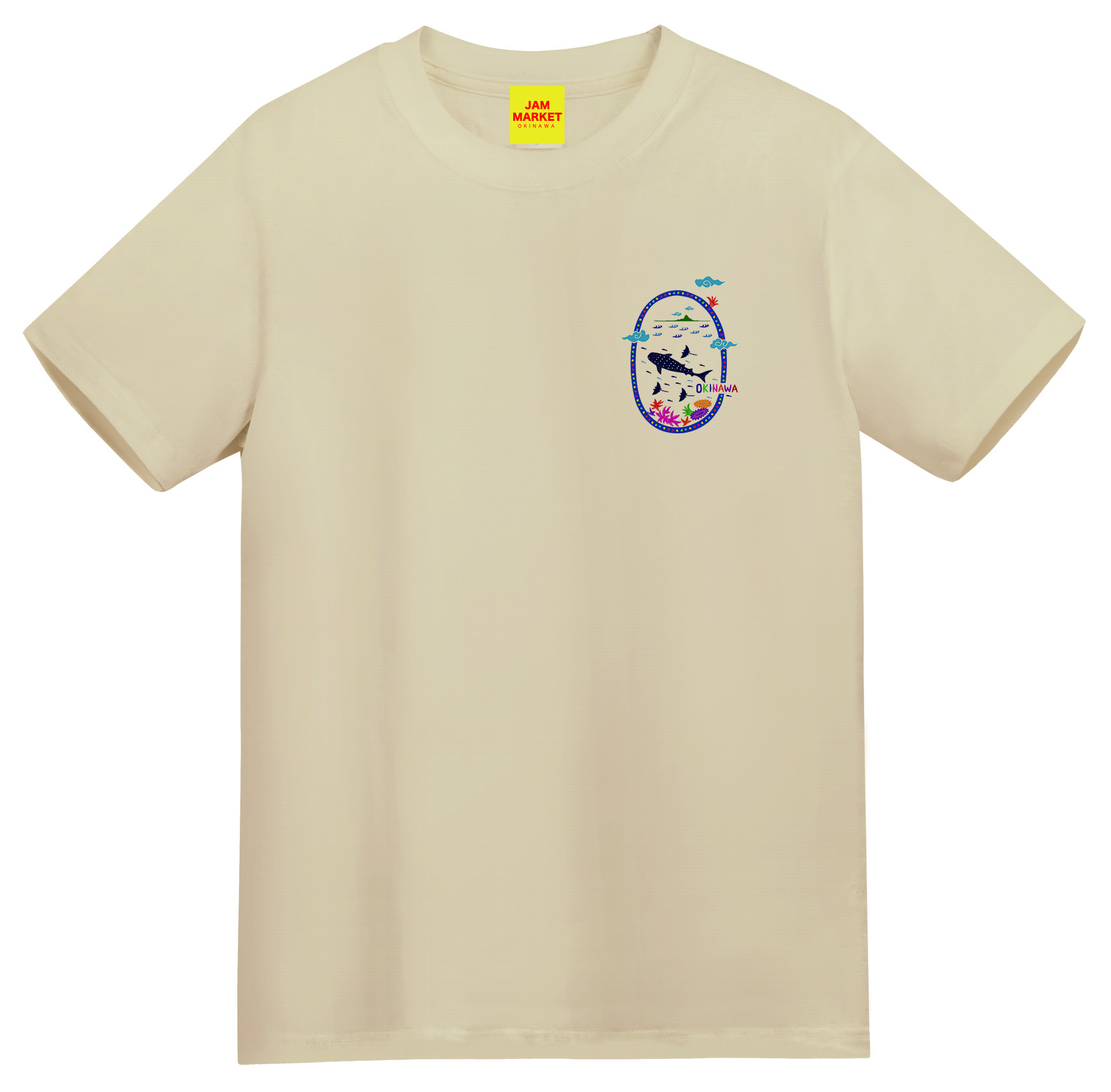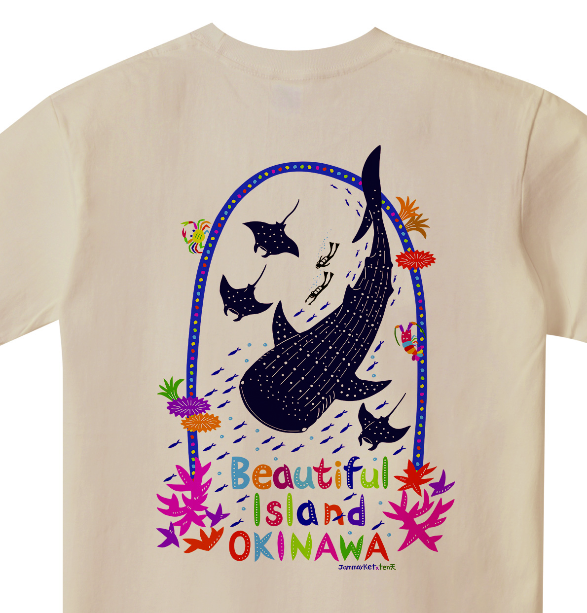 背面にダイバーがジンベエザメ、海の生き物たちとダイビングをしている