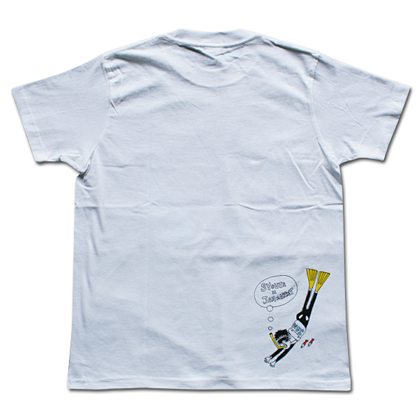沖縄で活躍するアーティストSYOUTAとのコラボTシャツ。海の生き物をテーマでデザイン。ジンベエザメ、マンタ、マンボウといった魚達が優雅に泳いでいます。背面にはダイバーいます。